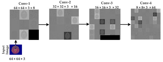 The approximate images achieved after applying 3 levels of decomposition using Harr wavelet are then fed to CNN algorithms for classification. As discussed earlier, the original images are of size 512 × 512 × 3 but after 3 levels of decomposition, the size is reduced, and 64 × 64 ×3 approximate images are achieved, which are further fed to CNN algorithms. 64 × 64 images are then rotated in different angles for the best learning rate before feeding to the CNN algorithm. The CNN algorithm takes the 64 × 64 approximate images as input, and eight different mean filters have been applied to images in the convolutional layer of the first block of the proposed model, as shown in Figure 8. In the second convolutional layer of the second block, 16 mean filters are convoluted on the features map of the first block after applying the ReLU activation function, batch normalization, and a (2,2) max pooling.