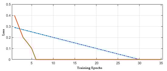 The CNN model’s training is first carried out on a given dataset with trial and test error methods because there is no proper mechanism for an appropriate number of layers selection. Hence, the different number of layers (6, 10, 15, 20, 25, and 30) have been tried to obtain the best results, but when the number of layers increases or decreases from 25, then validation error is increased. Hence, in the proposed CNN model, 25 layers have been selected for further experiments. The hyperparameters castoff in our methodology is illustrated in Table 4. The stability of the network mostly occurs after 30 epochs; hence the total number of epochs that have been chosen here is 40 to train the model effectively. The validation errors are given in Table 5. In the proposed work, 70% of data have been selected to train the network, and 30% has been used for testing. The loss rate of the proposed model is shown in Figure 9. The proposed work binary classification has been performed to classify the brain MR images into normal or abnormal. In Figure 9, the training epochs are denoted by the x-axis and the y-axis denoting error or loss rate. The best prediction scores for training and VEs are obtained, indicating a reciprocal relationship between losses and accuracy.