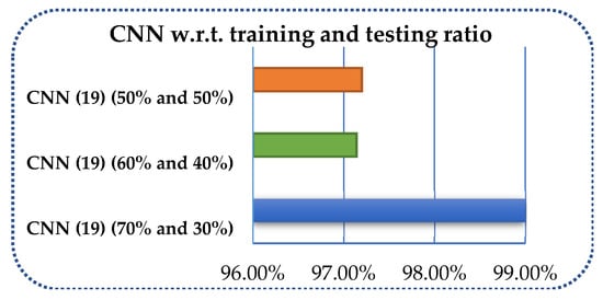 Secondly, despite the accurate number of layer specifications, the measurement of the proposed method has been carried out using different amounts of data for training and testing. The data have been divided into 70 and 30%, 60 and 40%, and 50 and 50% in the proposed CNN model, and performance measures have been calculated for each splitting as shown in Table 7 and Figure 11.