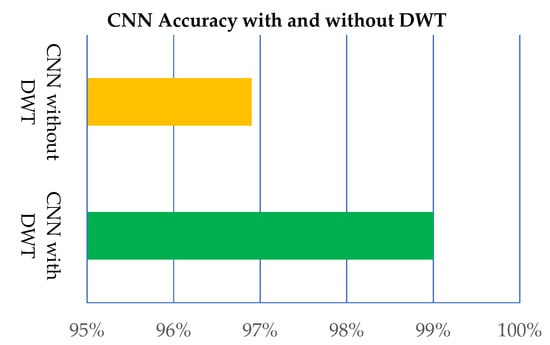 Further, the proposed model is applied without DWT and with DWT, as shown in Table 8 and Figure 12. The results provided by the proposed CNN model with DWT are better than the CNN without DWT.