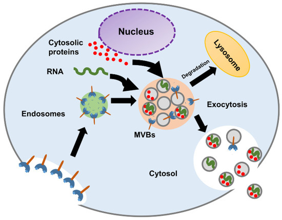 For the first pathway, the MVBs are hydrolyzed by the lysosomes. When the MVBs fuse with the plasma membrane, the exosomes are released into the extracellular space []. Studies have indicated that the formation of ILVs and the process of exosome release are mediated by tetraspanins (CD9, CD63, CD81), glycan modification, and Rab guanosine triphosphatases (RAB 27A, RAB 27B, RAB 31, and RAB 11) [,,,]. The complex underlying biology of exosome formation and what factors govern the transition of the MVBs to the exocytic pathway or the degradative pathway remain to be further characterized [].