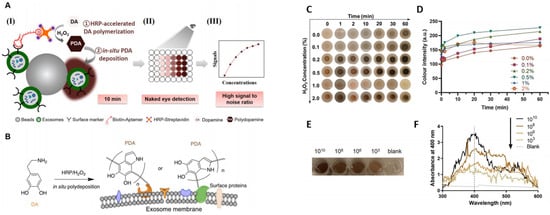 (A) (I) Exosomes were anchored on sulfate/latex beads by aldimine condensation followed by binding to a CD63-specific aptamer conjugated to biotin. Incubation with streptavidin-conjugated HRP converted colorless dopamine (DA) into brown-black colored polydopamine (PDA). (II) The color change is proportional to exosome concentrations. (III) The absorbance signals of the reaction can also be measured at 400 nm. (B) Schematics of the deposition of PDA onto the exosome membrane. (C) The color change of PDA deposition at the target site of HRP at different H2O2 concentrations. (D) The change in the color intensity is a function of time and H2O2 concentration. (E) Images of exosome samples after color development in the ExoAptaSensor. (F) Absorbance peak at 400 nm correlates with exosome concentrations. Reprinted from Development of a simple, sensitive, and selective colorimetric aptasensor for the detection of cancer-derived exosomes, Volume 169, Xu et al., 2020a, Page No. 112576, Copyright 2020, with permission from Elsevier.