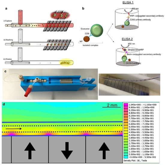 (a) Exosomes are captured by antibody functionalized nanoparticles (Fe3O4-EDC-NHS-NP: anti CD9). (b) ELISA was performed to quantify exosomes and to measure CA19-9 levels. (c) Experimental setup and capture of the magnetic particles in the channel. (d) Simulation of the magnetic gradient. Reproduced with permission from Sancho-Albero et al., 2020 under Creative Commons Attribution License (CC BY 4.0), Copyright 2020, Springer Nature.