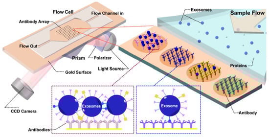 Surface plasmon resonance (SPR) is defined as the resonant oscillation of the electrons stimulated by the incident light at the interface between a negative and a positive dielectric constant material. This oscillation enables the sensitive detection of change in the boundary conditions, which is employed for the detection of adsorption of biomolecules to the surface [,]. Microfluidic-based SPR is an emerging method of exosome isolation due to its cost-effectiveness, portability, and the ability of fast and label-free detection. An on-chip SPR sensor was developed for the isolation and quantification of tumor-derived exosomes. The gold surface was functionalized with antibodies specific to exosome surface markers, and the refractive index changed upon the binding of the vesicles to the capture antibodies. The antibody array enabled the multiplex analysis of the surface markers in a single sample (Figure 6) [].