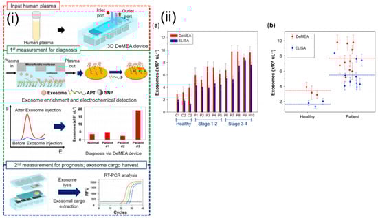 (i) Schematics and experimental workflow of the microfluidic platform with electrochemical aptasensor (DeMFA) for the quantification and cargo analysis of exosomes. (ii) DeMEA and ELISA quantification of exosomes derived from plasma samples of healthy and MCF-7 cancer cells represented in: (a) bar graph, (b) scatter graph (n = 3).Reprinted from Detachable microfluidic device implemented with electrochemical aptasensor (DeMEA) for sequential analysis of cancerous exosomes, Volume 169, Kashefi-Kheyrabadi et al., 2020, Page No. 112622, Copyright 2020, with permission from Elsevier.