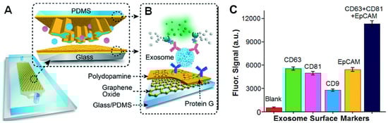 Immunoaffinity-based approaches are employed for the isolation and quantification of exosomes that express specific surface markers. The specificity of the antibody and the degree of nonspecific binding of the exosomes to the surface affect the purity of the exosomal subpopulation. The antibody-based isolation of exosomes using the anti-CD63 antibody was successfully performed on a microfluidic device with herringbone groves that ensured efficient mixing, manipulation, and separation of the fluid and the vesicles []. Kanwar et al. developed an anti-CD63 antibody functionalized PDMS microfluidic chip for the isolation of exosomes from serum samples []. A glass-PDMS device coated with graphene oxide and polydopamine was employed for the selective capture of CD81 expressing exosomes from plasma samples (Figure 8). This nanostructured interface improved the efficiency and reduced nonspecific binding to the surface of the device while providing a 4 log dynamic range of detection. The platform was successfully employed for the detection and discrimination of exosomes derived from ovarian cancer patients and healthy individuals using 2 µL of serum []. Zhang et al. developed a herringbone mixer-based microfluidic chip that was able to directly separate exosomes from plasma using an immunoaffinity-based approach. This method enabled the successful enrichment of pancreatic cancer expressing Glypican-1 exosome subpopulations with 75% efficiency []. Recently, another research group demonstrated the feasibility of a solid-phase, microprobe-based technology for CD63-specific exosome purification that can further be integrated with a microfluidic platform for high-throughput and integrated omics analysis []. The ExoPRIME tool provides a Precise, Rapid, Inexpensive, Mild (non-invasive), and Efficient (i.e., PRIME) alternative for exosome isolation and analysis from both conditioned astrocyte media (CAM) and enriched exosome suspension (EXO). The results indicated that the reduced temperature with extended incubation times ensured high probe loading capacity (24 × 106 exosomes per microprobe). The probe (3 mm × 130 µm) captured a sufficient number of vesicles for subsequent genomic and proteomic analysis. The RNA capture efficiency was 0.54 ng probe−1 and 0.30 ng probe−1, respectively, for the EXO and CAM samples. The reported protein loading capacity was 940 ng probe−1 and 728 ng probe−1, respectively, for the EXO and CAM samples []. The same research group has also designed and mathematically identified the optimal design parameters of a microfluidic cell co-culture device with a pneumatically controlled valve that can be integrated with the ExoPRIME capture method for genomic and transcriptomic analysis of exosomes derived from the central nervous system and astrocytes [].