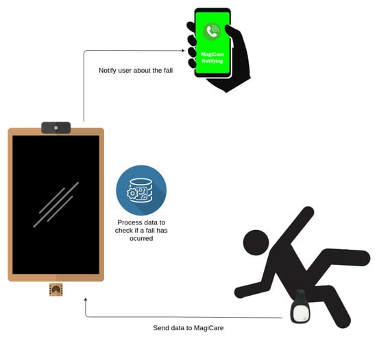 The sensor collects data from the user’s movements and sends it back to smart mirror platform. The smart mirror collects this data, and from it, it will be able to recognise whether the user has suffered a fall. This process is based on a machine learning model, which has been previously trained with data from 17 different subjects. An SVM (Support Vector Machines) model has been used as it is the one that has the best performance in this type of problems. These 17 subjects performed different activities in a controlled environment, classified into ADLs (Activities of Daily Living) and falls (dataset publicly available (https://arcoresearch.com/2021/04/16/dataset-for-fall-detection/ [accessed on 13 October 2021])). From these activities, labelled data were generated and used to train the model to discriminate when a fall occurs. After testing the model, an accuracy of 100% can be reported in controlled environments.