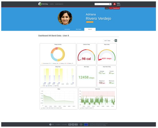 According to the WHO [] “at least 80% of all heart disease, stroke and diabetes and 40% of cancer could be prevented” by tackling the most common risk factors underlying the most prevalent chronic conditions, such as unhealthy diets, physical inactivity, hypertension or obesity. Off-the-shelf devices and Apps can be found for physical activity and weight management such as those of Fitbit (https://www.fitbit.com [accessed on 12 June 2021]), Apple (https://www.apple.com/es/watch/ [accessed on 20 June 2021]), Google Fit (https://www.google.com/fit/ [accessed on 20 June 2021]) or Xiaomi Mi Band (https://www.mi.com/es/mi-smart-band-5/ [accessed on 20 June 2021]). They all offer a range of functionalities for user engagement, monitoring, reminders for promoting a healthier lifestyle, etc. Most of these commercial solutions offer open APIs, so that third party applications can access the data they collect. Thus, efforts can be focused on what to do with the data rather than how to collect them. However, a recent study [] concluded that there is little evidence that wearable devices could improve health outcomes in older adults, although they could improve motivation and physical activity. Current approaches rely on wearable devices as enablers of behavioural change and most studies to date focus on healthy individuals rather than on those already suffering from a chronic condition or multi-morbidity.