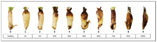 Disease scale used to score Rhizoctonia root and crown rot in sugar beet based on the percentage of rotten root surface area.