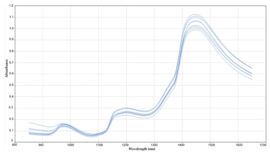 Another useful indicator in the development of calibration models is the RPD, which has been used for several years in NIR studies of agricultural products [,]. It enables the evaluation of the SEP in terms of the standard deviation of the reference data. The RPD values considered appropriate for each NIRS analysis may change depending on the nature of the material. Within agricultural applications, values higher than 3 may be difficult to obtain, and often models with RPD > 3.5 are considered very good [,]. Therefore, the RPD values of 4.131 in the calibration and 3.677 in the prediction found in this study corroborate the goodness of fit of the NIR predictions developed here.