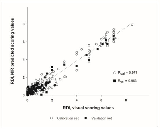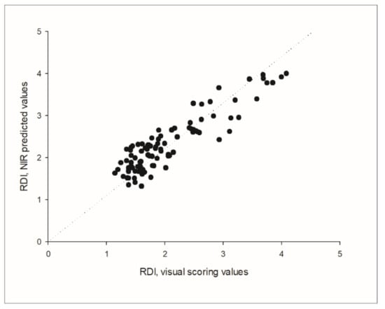 Other parameters providing information about the prediction accuracy are the SEP, RMSEP and the bias. Ideally, predictions should be as accurate as possible, resulting in low RMSEP and SEP values []. The bias is a good indicator of similarity between validation samples and the calibration set [], conveying a further measure of the goodness of the fit. In sum, the bias of −0.029 obtained in this application together with the SEP and RMSEP values indicate a good adjustment between the predicted NIRS values and the RDI visual scoring of the beets. Moreover, the high correlation observed between the NIR prediction and the RDI values from the external independent validation set argues against a possible overfitting of the model and corroborates the efficiency of this NIR application.