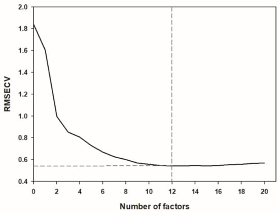 The optimal calibration model was developed by using PLSR method as linear regression and for that, the number of factors used in the model is of crucial importance. The optimum number of factors (in this model considered 12) is usually the number where the Root Mean Square Error of Cross Validation (RMSECV) has its first minimum and is found through the cross-validation process, decomposing the spectral data matrix between the informative part of the spectral signature and the noise []. If the full set of factors is used (in our case 20), there is no clear distinction between the informative part of the spectral signature and the noise, thus generating an overfitted model that would include parts of the spectral noise of the calibration set spectra as prediction relevant variables. This would result in a poor performance in the validation set prediction despite of a low RMSECV. On the contrary, the use of too few factors would result in an underfitted model [,]. Thus, the number of factors here found optimal might be considered one of the indicators of the good fit of the prediction model.