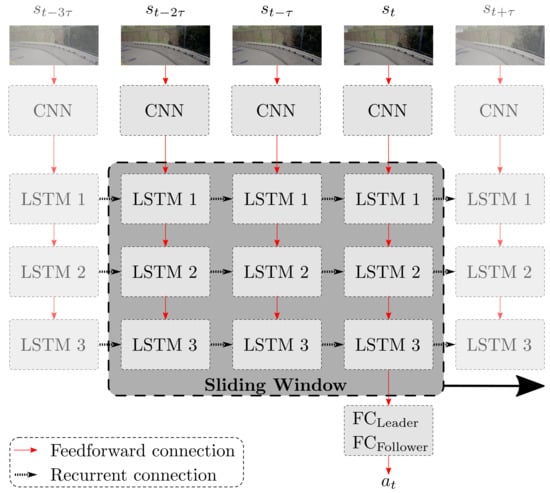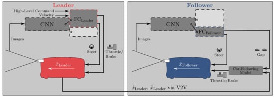 Similar systems have been tested in recent years, with training data either taken from real-world datasets [,,,,,] or generated in simulations [,,,]. Some of this research explored the benefits of including temporal dependencies between consecutive images by adding recurrent layers to the network. For example, References [,,] added long short-term memory (LSTM) layers on top of the CNN. The CNN was responsible for feature extraction of the images, while the LSTM incorporated features of the last time steps for the driving decision of the current time step. Reference [] followed the same approach and additionally implemented the end-to-end approach in a simulated urban environment. To obey the traffic rules, the authors added additional inputs to the network, such as the relevant traffic light state and speed limit. Application of end-to-end self-driving to vehicle platooning: The above works did not address end-to-end deep learning algorithms that are specifically designed for the application in vehicle platoons. This topic was first addressed in [,].
