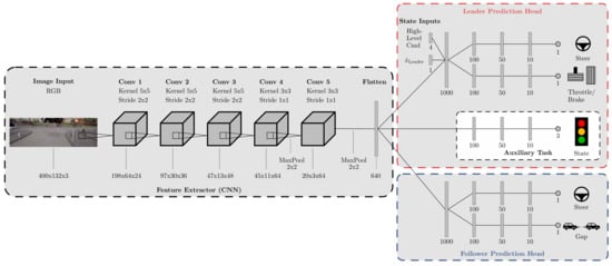 The detailed multi-task neural-network architecture is shown in Figure 2. The feature extractor is similar to the CNN of PilotNet []; however, two additional max pooling layers are inserted after the last two convolutional layers to reduce the dimensions. The input of the feature extractor is RGB images with pixels normalized to . The feature extractor output is shared by the prediction heads of the leader and the follower.