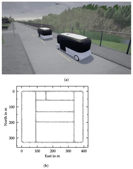 Our experimental vehicles in the simulation were minibuses with a length of 6 m; see Figure 4a. The specifications of these minibuses are similar to 2getthere’s GRT [] or Navya’s Autonom Shuttle Evo []. Each vehicle was equipped with three front-facing cameras: a center camera at a height of 2.7 m and two cameras located at the left and right at a distance of 0.5 m from the center camera. Only the center camera was used during testing. The off-center cameras simulated a shift from the center of the lane and improved the ability of the network to recover from disturbances, as with []. The image resolution of each camera was pixels with a field of view of and a pitch of . We recorded at 10 fps, as a higher sample rate would produce more similar images.