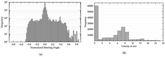 The majority of the training data consisted of images showing the vehicle driving straight, as seen in the histogram in Figure 5a. The higher the steering angle was, the fewer training samples were in the dataset. Note the asymmetry with more samples showing higher right steering angles (positive) than left steering angles (negative). This is because of the right-hand traffic in the simulation, which usually leads to higher steering angles for right turns than for left turns. Training with a dataset containing mainly steering angles around zero degrees could have led to a network that was biased towards driving straight. To compensate for this, we upsampled images showing higher steering angles. We selected a steering angle threshold of , and images satisfying this threshold were upsampled with a factor of three. Many samples of the training dataset showed the vehicle waiting at a red traffic light with a velocity of 0 m/s (Figure 5b). While staying static at a red traffic light, the images were nearly identical. For this reason, we downsampled these images by reducing their occurrence by 50%.