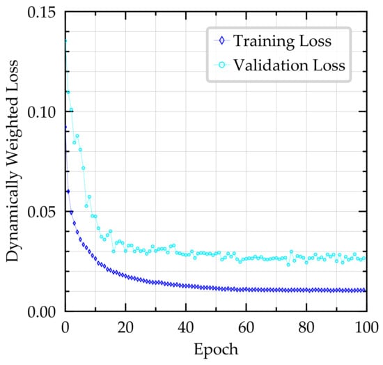 Dynamically weighted loss curve for Model A. The validation loss is calculated at the end of every epoch. Note that for this model, the lowest validation loss was achieved at Epoch 74.