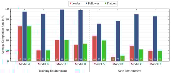 Point-to-point routes: The results of the quantitative evaluation of the point-to-point routes with a static environment are summarized in Figure 7. The graph shows the average completion rate of the point-to-point routes for Models A–D. The results for the platoon refer to a two-vehicle platoon consisting of one leading and one following vehicle. In general, all models performed better in the training environment than the never-seen-before environment, which was to be expected.