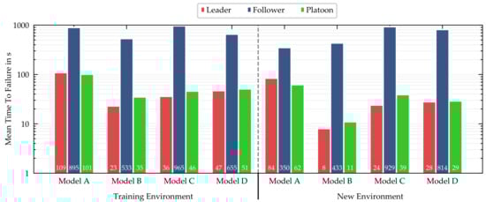 Free driving: The MTTF results are summarized in Figure 8, separated into model (A–D), scenario (leader, follower, platoon), and environment. In case the failure was caused by casual confusion, the TTF was taken at the moment the vehicle stopped. The MTTF results confirm the ACR results of the point-to-point routes, with minor exceptions. We limited the maximum TTF per episode to 1440 s; however, the longest episode without failure for the following vehicle lasted close to one hour and covered nearly 14 km of autonomous driving before it was stopped manually.