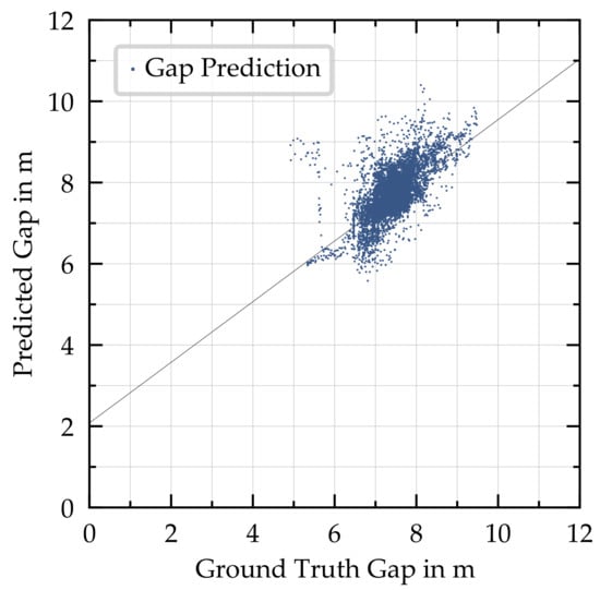 Accuracy of the gap prediction. Every point is a gap prediction captured on a single route, with 14,400 predictions in total. The solid black line indicates the linear regression of all points.