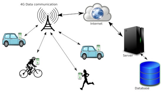 The architecture of our proposed solution is composed by vehicles carrying smartphones, the 4G LTE cellular networks, and a centralized cloud server accessible via the Internet, as shown in Figure 1.