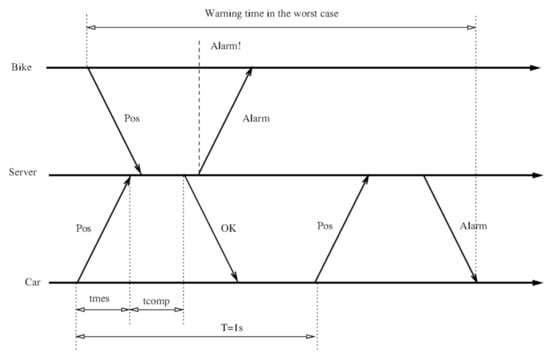Worst case situation to receive a proximity warning: the server receives the position update from the bike just when it has started to process the car position update looking for alarms. It is possible that the recent message from the bicycle is not taken into account, causing the alarm to be delayed until the next message is processed.