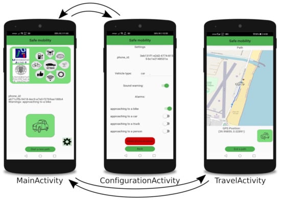 The Android application we developed for our tests, SafeCyclists, has three activities. MainActivity is presented when launching the application. The first time that the application is executed, the user can only register the phone in the server anonymously. In the following executions, the user can switch to the other two activities, ConfigurationActivity and TravelActivity. Figure 3 shows the activities and how the user can alternate them.