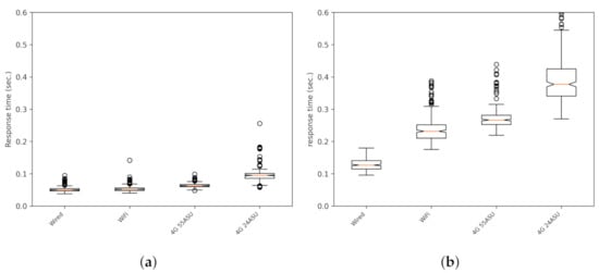 Response times for static clients with either UDP or HTTP and for different types of network connections. In these tests, there were no outdated messages. (a) UDP; (b) HTTP. ASU, arbitrary strength unit.