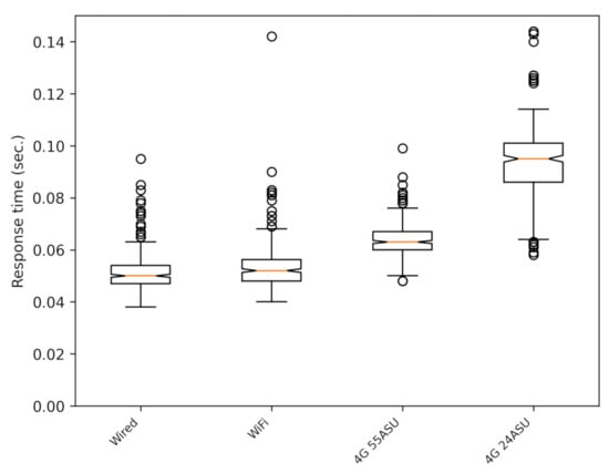 In Figure 5a (SafeCyclistsUDP), Figure 5b (SafeCyclistsHTTP), a comparison of both versions is shown as boxplots (In all boxplot figures in the paper, the circles are outliers. These values are bigger than 1.5 times the interquartile range, and they allow for a better representation of the dispersion of the data set. Note that these outliers are not outdated messages, and they are considered correct for our system.). In this case, the tests correspond to static clients, and the experiments correspond to different connection types: wired connection, with a Huawei smartphone connected via WiFi (same Internet connection a the wired case), and the smartphone connected by the cellular 4G LTE telephony data with good (55 ASU) and poor (24 ASU) signal strength levels (the value used to express the signal strength is the arbitrary strength unit (ASU), given that, contrarily to dBm, this unit provides a unified idea of the signal power independently of the cellular phone technology used along a route []). It can be seen that the response time is, again, at least three times better in the UDP than in the HTTP version, all with similar levels of lost or outdated response messages (responses arriving after the one second deadline). Both figures have the same scale. Figure 6 shows the same data as Figure 5a, but with an adapted scale.