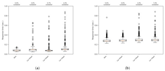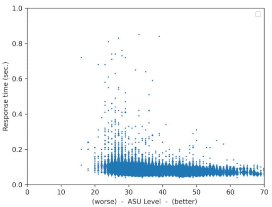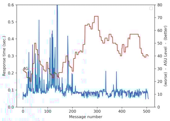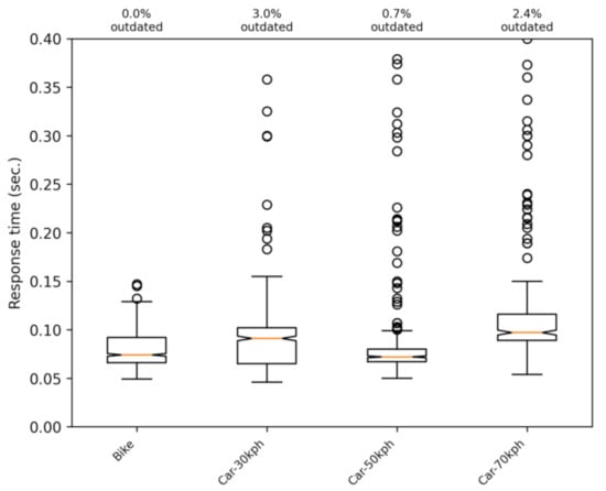 Figure 10 was obtained by accumulating the data of trips with different routes and different speeds. This figure represents 13,098 messages with 2015 outdated messages (15.5%), that is messages arriving after the deadline of one second (the percentage of outdated messages provides an idea of the reliability of the system, as if the outdated message is an alarm notification, it would arrive too late to the vehicle). This figure shows that there is a correlation between response time and signal power. The L shape shows a weak correlation between the two variables, given that, with poor signal levels, there is a moderate increase of the response time. When the signal level improves, the values of the response time tend to stabilize.