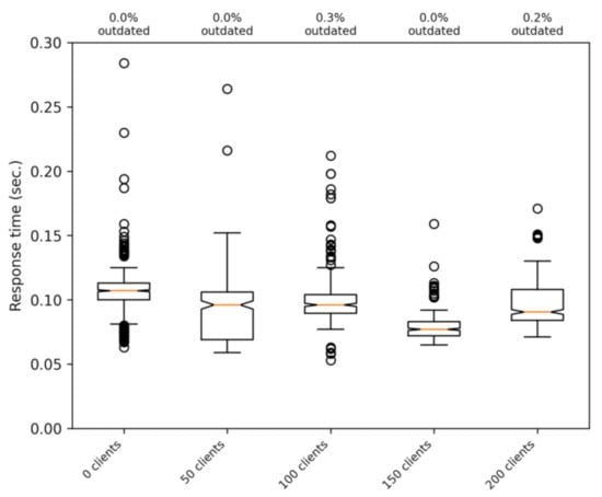 Figure 11 shows the response time with a different number of simultaneous clients. In these tests, the real client has a good signal strength (between 25 and 30 ASU), and to discard interference with other phenomena, we used a static client. It can be seen that the response time is not affected by the number of clients until both CPUs of the virtual computer running the server is at 100% of usage. The saturation of the server is reached when having about 250 clients, and this is mainly due to the tasks performed by the PostgreSQL database to handle messages. In the tests shown in the figure (up to 200 clients), there are no outdated messages. This means that the bottleneck is our simple version of the server, and not the communications part of the system.