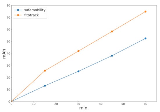 Another important aspect for a wide acceptance of the application is battery consumption, especially for non-motorized vehicles without a power supply. We compared the application energy consumption against Fitotrack [], another application that only makes use of GPS. These power consumption values are shown in Figure 12. The data in this figure correspond to one hour using the applications with the screen turned off. As can be seen, the consumption of our SafeCyclists application is slightly less than the Fitotrack application, and we found that battery consumption remained below 2% for a smartphone with a 3000 mAh battery (which is a standard capacity currently).