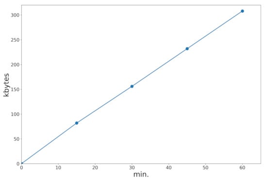 Data consumption is another aspect of interest for users having a limited quota of data. We measured this consumption, finding it to be about 300 kbytes per hour if the application was just used to periodically send the position (see Figure 13). This is a reasonable rate of consumption compared with many common-use applications. If the user wants to see his/her position on a map, then the map tiles could eventually be downloaded as well (about 3 Mbytes an hour on foot). However, in any case, map tiles can be cached, and they are not necessary to use the proposed alarm system.