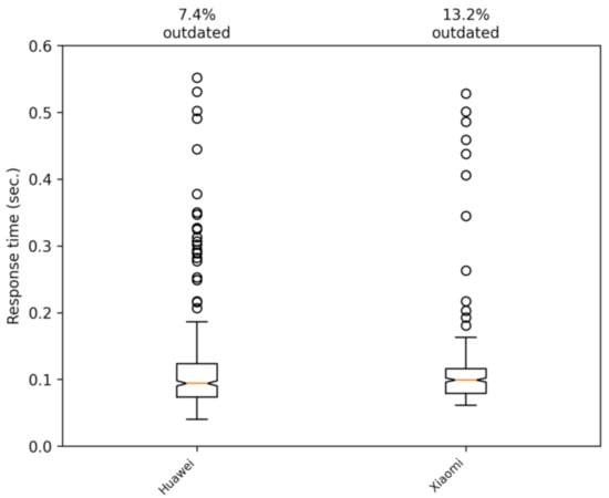 Next, we proceeded to determine if there were significant performance differences when comparing different smartphones. Thus, two mid-range smartphones were used in our tests: a Huawei P30 Lite and a Xiaomi Rednote 9 Pro. The telecommunications operator in both cases was Simyo (https://www.simyo.es, accessed on 15 March 2021), which operates over the mobile infrastructure of the Orange company (https://www.orange.es, accessed on 15 March 2021) in Spain. We performed some tests to verify that the phones models we used in the experiments had no effect on the response time of the application. The tests were carried out on the campus of Jaume I University on foot and by car. The results are shown in Figure 14 and Figure 15. These figures show that the differences between the two phones are mostly insignificant.