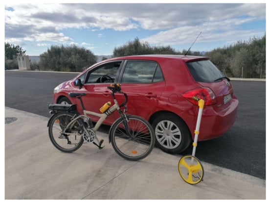 The car, the ebike, and the topometer used in the validation tests.