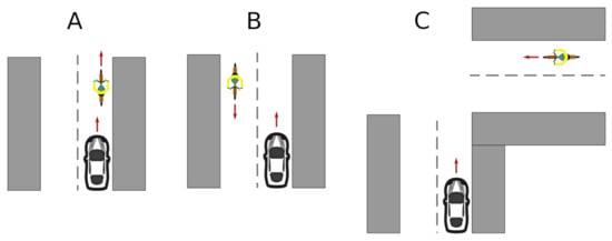 The remaining scenarios are shown in Figure 17, and they consisted of: both vehicles traveling in the same direction (A), in the opposite direction (B), or meeting at a 90° road crossing (C).
