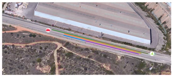 Table 1 and Table 2 show the distance at which the warning is shown to the user of the application when both vehicles move in the same direction and in the opposite direction, respectively. In all cases, the bike was moving at 20 km/h, while the car moved at 30, 50, and 70 km/h. In these tables, it can be seen that, when increasing the relative speed, the distance at which the alarm pops up was reduced. Furthermore, the accuracy of the GPS must be taken into account, as it is known to introduce an uncertainty of about 5 m even when it is working under the best case scenario []. In any case, the distance needed to stop the car before reaching the bicycle was found to be enough in all test cases, as can be seen in Figure 18.