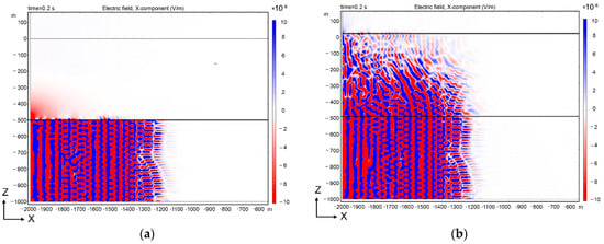 Figure 1 shows the simulation data of the seismo-electric effects for a poroelastic medium according to the above Equations (1)–(8). In this case, the amplitude of the induced field Ex is shown. The calculation is given for two cases when a layer from 0 to −600 m is not a poroelastic medium (Figure 1a) and when it is (Figure 1b). The implementation of white noise in the frequency band 0.1–100 Hz was used as the emitting signal.