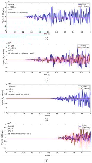 Simulated time series of the vertical velocity and the horizontal component of the electric field at two points on the day surface. (a) Figure at the coordinates x = −1500, z = 0 layer where there is the poroelastic medium (up z = −500 to z = −1000) in which there is a SE effect, (b) where there is the poroelastic medium(up z = −0 to z = −1000) in which there is a SE effect, (c) figure at the coordinates x = 0, z = 0 layer where there is a poroelastic medium (up z = −500 to z = −1000) in which there is a SE effect, (d) the poroelastic medium (up z = −0 to z = −1000) in which there is a SE effect.