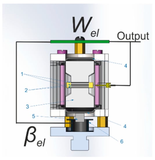 We chose a sensor to work as a geophone with increased sensitivity, the schematic design of which is shown in Figure 3. The sensing element is a liquid-permeable four-electrode electrochemical cell located in a housing filled with a highly concentrated electrolyte solution 3. The ends of the housing are limited by flexible membranes 4. Magnet 5 and coil 6, shown of Figure 3, form a mechanism for generating a feedback signal. The principle of operation is that the forces of inertia associated with ground vibrations set the fluid in motion. In turn, the flow of liquid through the conversion element changes the electric current flowing between the electrodes. The current variations are converted into an output voltage with a transfer function Wel at the outputs, which controls the feedback mechanism via a separate electronic stage with a transfer function.