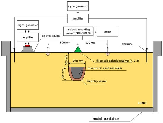 Physical modeling of the SE effects was carried out as follows. A reservoir of fired porous clay with a mixture of water, sand, and petroleum products was placed at a depth of h = 30 cm. The simulation of currents flowing through the medium was realized using grounded electrodes connected to a noise-like signal generator. Seismoacoustic signals were excited using acoustic emitters (i.e., low-frequency speakers) (Figure 5). To equalize the amplitude of the emitted signal at low frequencies, a software-implemented spectrum correction was used. The signals emitted by the noise generator were completely uncorrelated, which was experimentally tested on a tank with a sandy-clay mixture without a simulator of a hydrocarbon reservoir. When the noise signals were excited, the maxima of the cross-correlation function were absent.