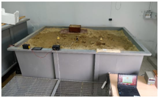 Laboratory studies were carried out to verify the results of the theoretical estimates and simulation results. The measurement scheme is shown in Figure 5. For this purpose, a special measuring stand was made on the basis of a metal basin with a volume of V = 8 m3, filled with a sand-clay mixture. The external view of the measuring stand is shown in Figure 6.