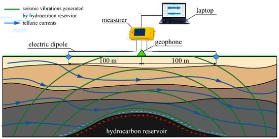 There are also developments concerning the application of the SE phenomena for geophysical exploration of hydrocarbon deposits by means of the impact on the formation of noise seismoacoustic (SA) fields emitted by drilling rigs during drilling and the interaction of these noises with the natural Earth EM field. In [], the results of studies are given, which, in the opinion of the authors, will make it possible to abandon the sources of both SA and EM fields only by observing passive seismoelectric effects. Only the frequency range up to 100 Hz has been analyzed. The use of this technology is possible both at the drilling stage and at the stage of primary exploration. It is shown that the use of external additional sources of seismic radiation only enhances the SE effect observed on the Earth’s surface. The authors estimated the depth of sounding for this method at 300 m and the registration of the EM field was organized using both magnetic antennas and active sensors of telluric currents.