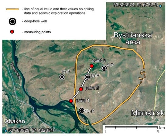 To analyze the effectiveness of the application of molecular-electronic sensors of seismic vibrations in comparison with induction geophones GS-ONE, three characteristic points on the gas condensate area were selected (Figure 8):