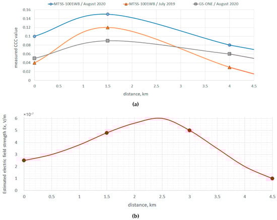 Averaged values of cross-correlation coefficient (CCC) obtained in 2019–2020 including when using new equipment (a), and the calculated graph of the electric field strength above the reservoir model (b).