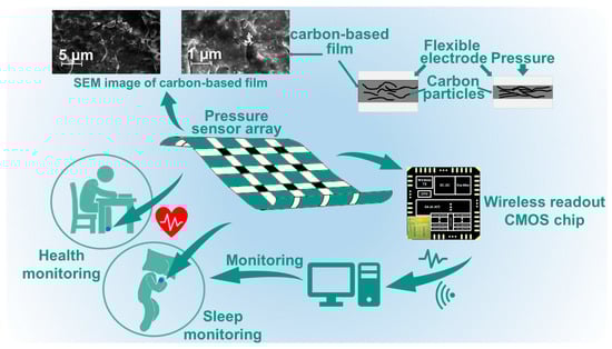 Figure 1 shows the diagram of the proposed remote health monitoring system, which includes a flexible pressure sensor array (RP-C7.6LT-LF2, Legact Technology Co., Ltd., Shenzhen, China) and a custom-designed wireless multi-channel voltage readout chip. Carbon-based film is used as the pressure-sensitive layer. It is a porous structure. The scanning electron microscope (SEM) image (shot by Zeiss Gemini 450, Oberkochen, Germany) in Figure 1 shows the carbon particles and porous structure of the sensor. As the sensor is extruded, more current conductive paths are created leading a lower resistance. The multi-channel readout chip acquires the resistance values and transmits them wirelessly []. Such sensor array data could be used for BCG signals detecting.