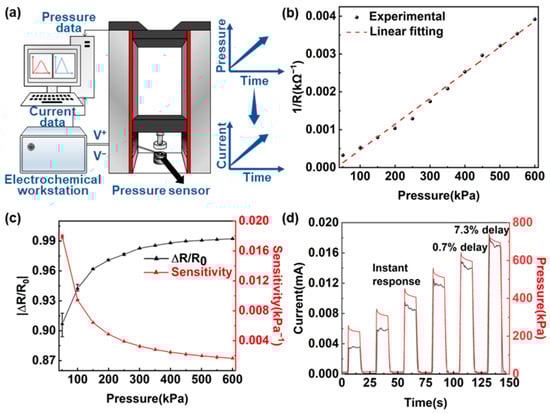 Characteristic test of the flexible pressure sensor. (a) The typical testing system of the flexible pressure sensor. (b) Changes in the reciprocal of resistance as a function of applied pressure. (c) Variations of deformation and sensitivity of five groups of samples with increasing pressure from 50 to 600 kPa. (d) The sensor output current changes with the step pressure, indicating its fast response.