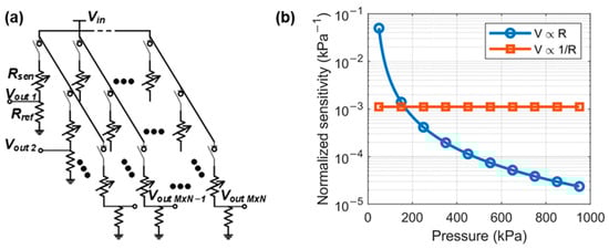 The electronic signal from the pressure sensors is collected and processed. In our sensor system, the relationship between resistance and voltage is nonlinear. A specific chip is needed to process such signal. Figure 3a shows that the sensor resistance is converted into voltage change by connecting a fixed-value resistor in serial to form a resistor divider. Each node in the sensor array is independently connected to a switch and a divider resistor to avoid crosstalk between different channels. Only the sensor node being measured is turned on to generate a pressure-depended output voltage signal, while the others are disconnected from the bias voltage. The output voltage  can be described as: