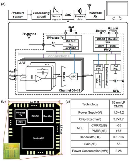 To further reduce the size and power of the proposed system, we utilize a self-designed 64-channel signal readout system on chip (SoC) to process the voltage-to-digital conversion and data transmission. As shown in Figure 4a, this SoC is composed of 64 analog front-end (AFE) channels, a data processing unit (DPU), a power management unit (PMU), and a wireless transceiver supporting radio frequency (RF) power harvesting. Each channel of the AFE includes a low noise amplifier (LNA) and a programmable gain amplifier (PGA), which are used to amplify the voltage signals from the sensor array shown in Figure 3a. A 10-bit SAR ADC digitizes every 16 channels at a sample rate of 40 kSps through time-division multiplexing. The DPU controls each block through on-chip registers and packages the output of ADCs into data frames. The frame packet is then sent through an on-off keying (OOK) transmitter operating at 3.2 GHz. The PMU includes a 13.56 MHz RF power harvester and a switched-capacitor DC-DC converter for wireless and battery-powered scenarios. On-chip low drop-out regulators (LDOs) and bias generators provide suitable operation voltage for each block [,]. Figure 4b shows the micrograph of the chip fabricated in a 65 nm complementary metal-oxide-semiconductor (CMOS) process with a total area of 3.7 × 3.7 mm2. Figure 4c summarizes the key specifications of the chip.