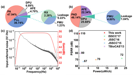 This chip supports dual-mode communication. In the wireless mode, the chip core consumes 2.28 mW from a 1 V supply, and the power distribution is shown in Figure 5a. The wireless data transmitter consumes most power, including the RF phase-locked loop (PLL) and the power amplifier (PA). Figure 5b shows the measured power distribution of the chip core in the wired-transmission mode. The total power consumption decreases to 0.48 mW. Figure 5c depicts the gain and input-referred noise (IRN) of the AFE. The measured mid-band gain of the AFE is 55 dB, and the −3 dB bandwidth is from sub-Hz to 10 kHz. The measured IRN is less than 8 μVrms integrating over the whole signal bandwidth. The chip can operate from a single supply ranging from 1.3 to 4.2 V. This chip also exhibits a higher power supply rejection ratio (PSRR) than the other work [,,,]. The replica-biasing scheme in the LNA guarantees a stable bias current despite high power supply interference without consuming much extra power and area []. The performance comparison with other works is shown in Figure 5d. The specifications of this chip are suitable for multi-mode physiological signal recording. The customized design has the advantage of low power and high channel count compared to commercially available chips.